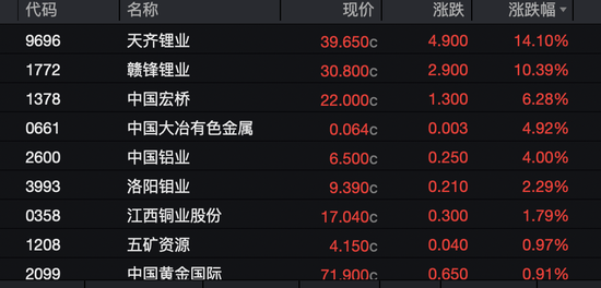天齐锂业、赣锋锂业上涨超10%,中国宏桥、中国大冶有色金属涨幅居前。
