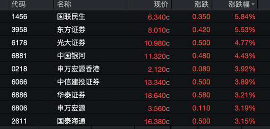 中资券商股国联民生、东方证券、光大证券涨幅居前。