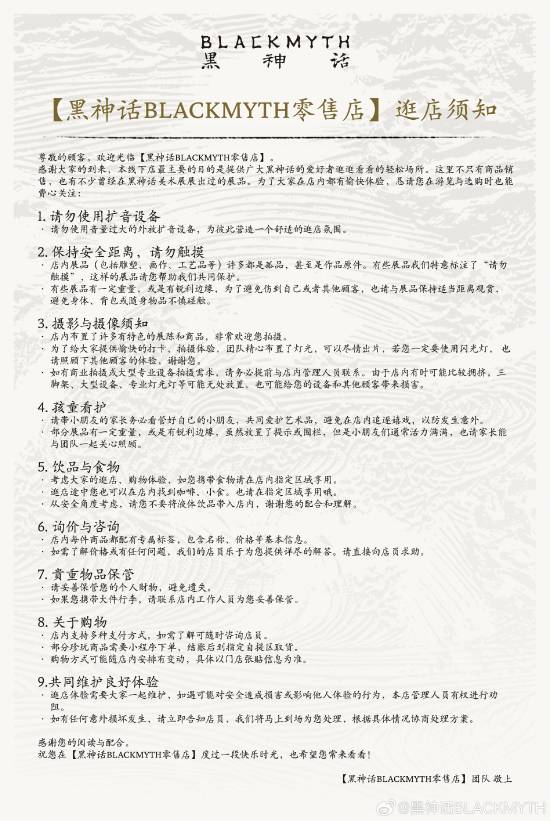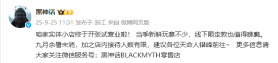 同日,《黑神话》官方发文表示:“咱家实体小店终于开张试营业啦!当季新鲜玩意不少,线下限定款也值得瞧瞧。九月余暑未消,加之店内接待人数有限,建议各位天命人错峰前往~更多信息请大家关注服务号:黑神话BLACKMYTH零售店。”值得一提的是,黑神话BLACKMYTH官方在微博发布了更多线下店铺内部的美图,一起来看下。