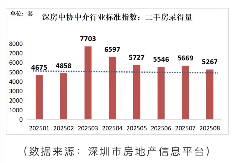 根据深房中协统计,8月深圳市二手房签约量为5267套,环比下降7.1%,同比增长12.8%。单月签约量已连续6个月超行业“荣枯线”。